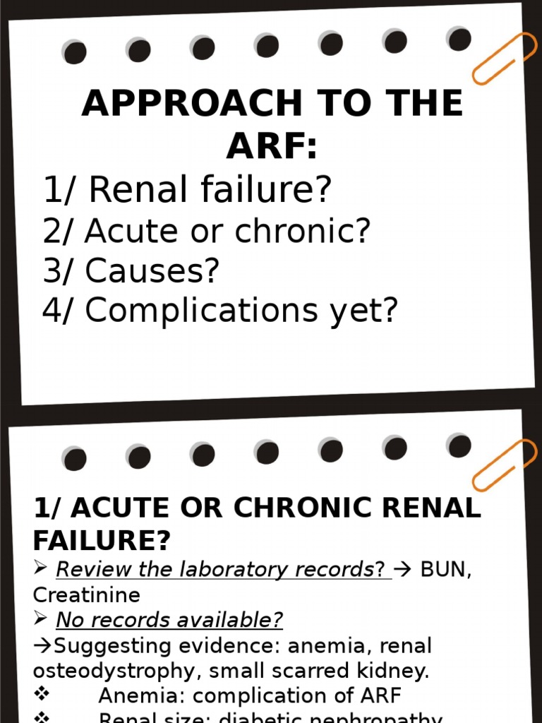 Acute renal failure the kidneys are vitals organs that are responsible for various function in the human body such as reabsorption, secretion and excretion. Kidney failure, also known as acute renal failure, has various warning signs everyone should be aware of. Acute renal failure is a serious condition with significant mortality1 and remains a frequent occurence in the setting of large general hospitals.z,3a previous reports on acute renal failure in kuala lumpur comprised patients treated at the department of nephrology at the general hospital kuala lumpur. It is associated with oliguria in about two thirds of cases. Emergency dialysis is necessary in this case.
